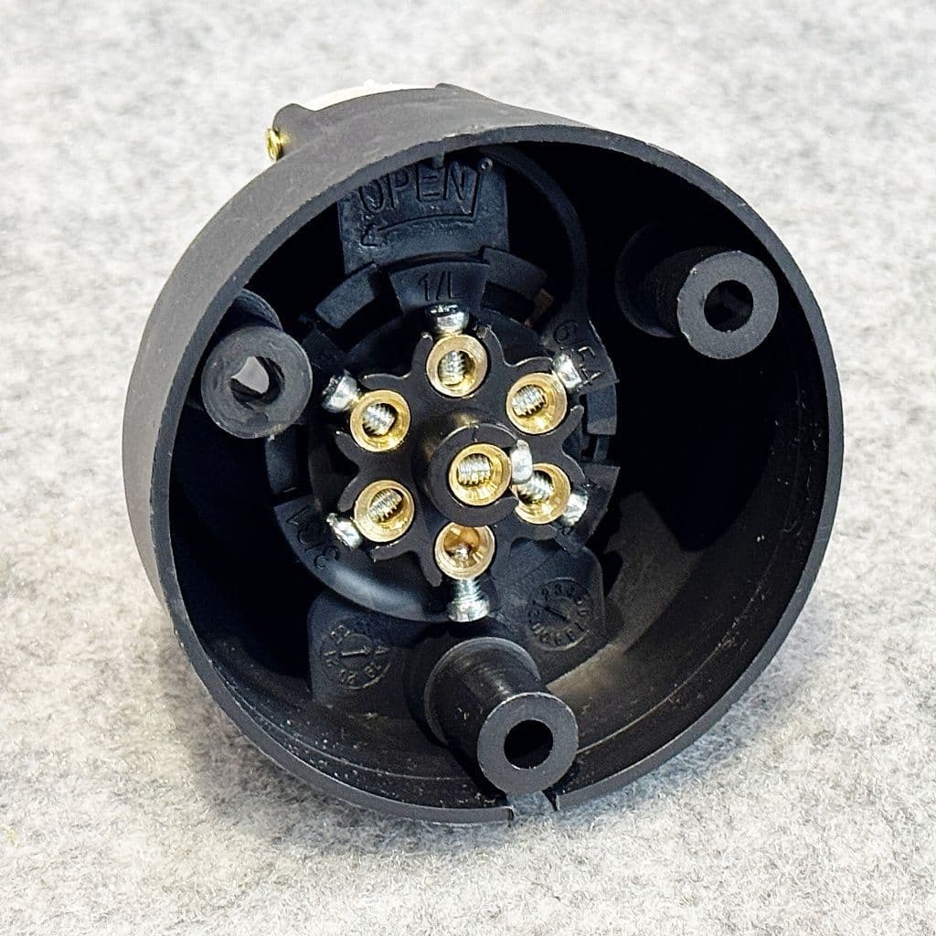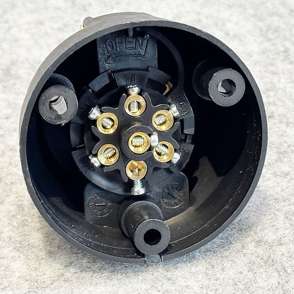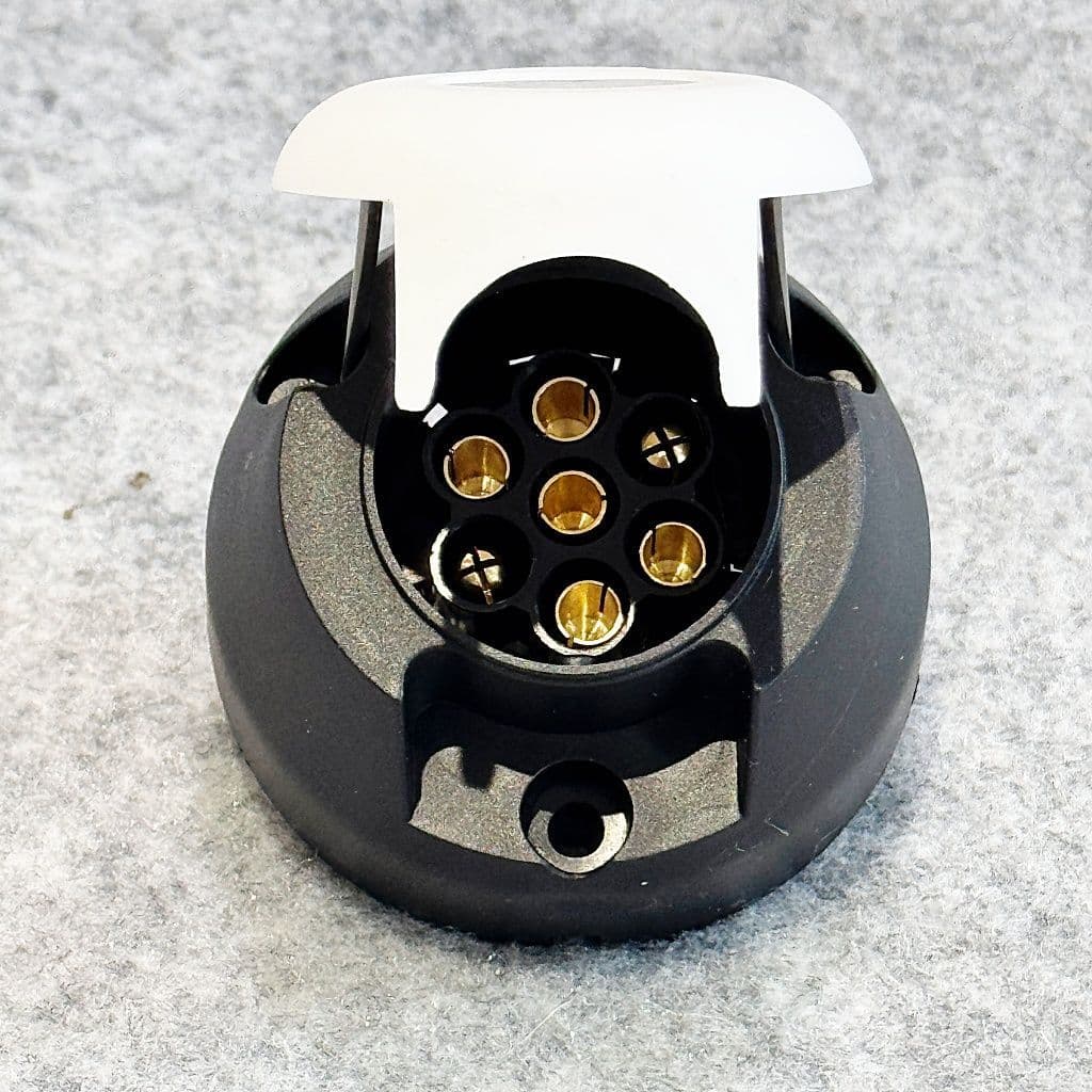 Standard UK 7-pin trailer socket with Grey and black plastic housing. 12S-type, to suit 12S grey towbar socket for powering trailer/caravan fridge, battery charging and reversing road lights.