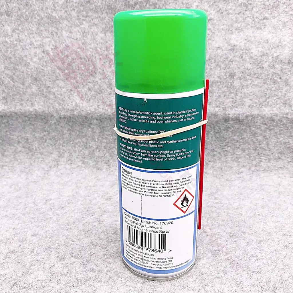 It can also be used as a general lubrication spray for most plastic, synthetic/natural rubber or plastic bearings, textile fibres, and more.